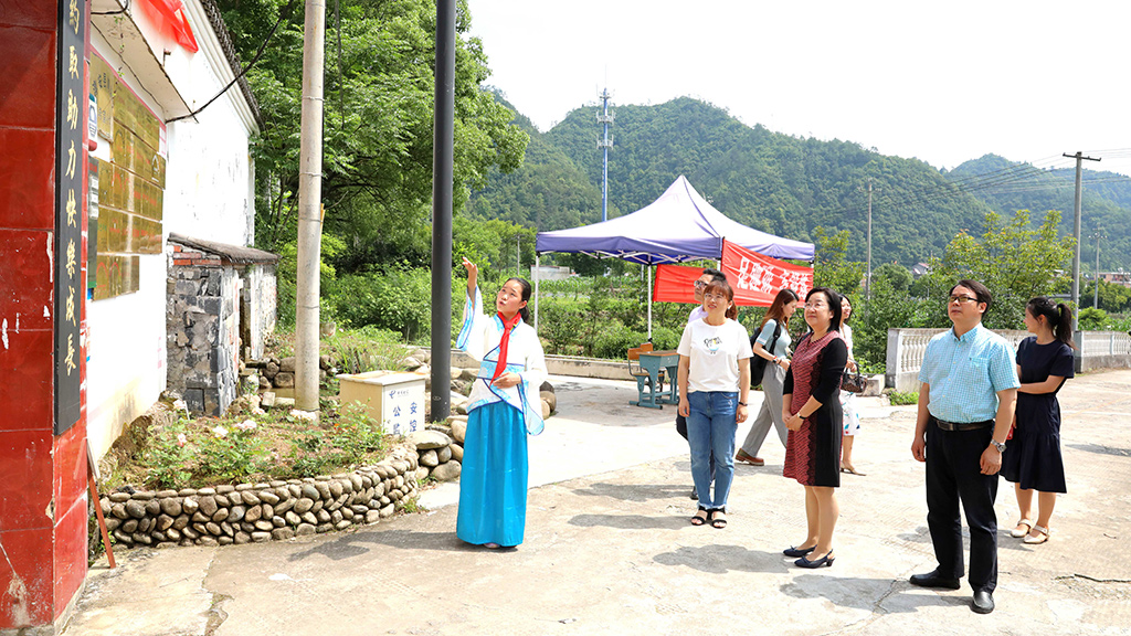 以茶文化為辦學特色的鳩坑鄉(xiāng)中心小學門口,小茶導正在介紹校園文化