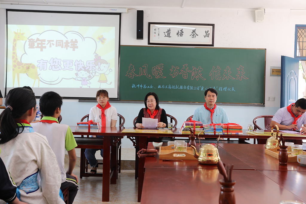 6月1日,“春風沐浴 溫暖閱讀”六一活動暨愛心書房捐贈儀式在淳安縣鳩坑鄉(xiāng)中心小學舉行。杭州市總工會保障工作部副部長湯澤勇、杭州工商信托首席財務官康波等領導嘉賓參加了儀式。